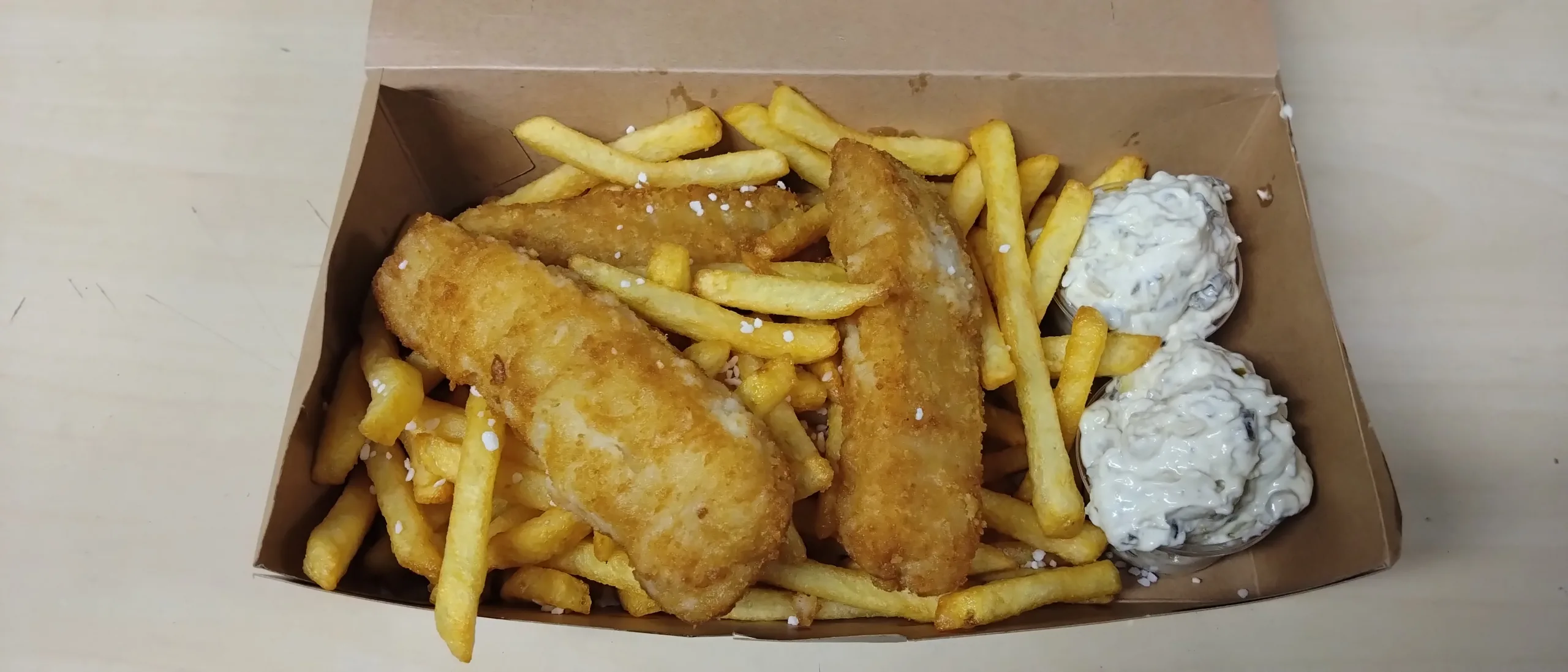 Du kan bl.a. købe Pizza – Pommes frites – Fisch and Chips
